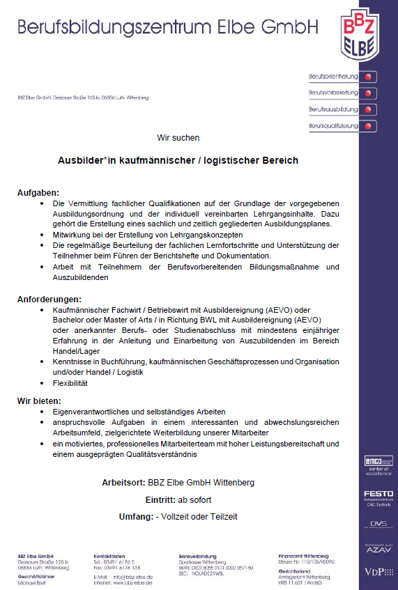 Die BBZ Elbe GmbH ist seit 1992 Ihr kompetenter und zuverlässiger Bildungspartner in der Region und darüber hinaus.
